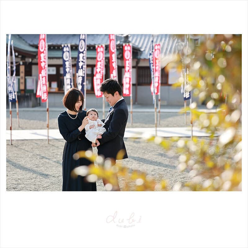 平日も土日祝も同じ料金なので、赤ちゃんのコンディションを一番に、ご家族皆さんご参加頂ける日が嬉しいですね。平日は混雑が少なくて、ご祈祷中や境内での撮影がスムーズで、ゆったりお参りして頂けるのでオススメです。